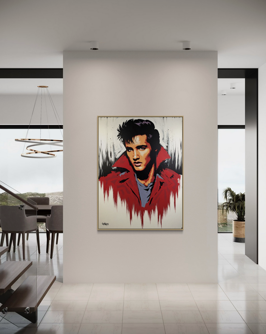 This 36×60 canvas is soaked in presence: deep reds, bold blues, and rich blacks layered in oil and acrylic on wood panel, sealed in resin and diamond dust like a red-carpet glow.
