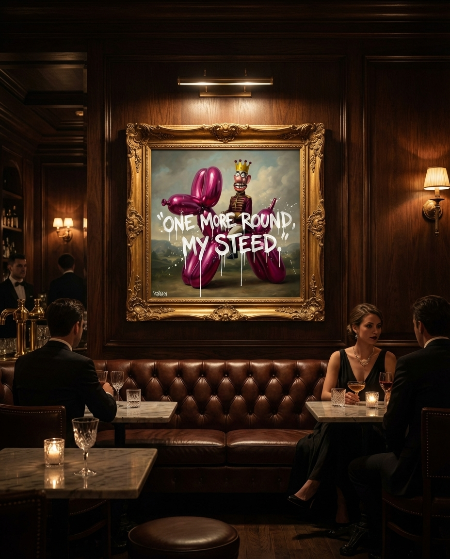 The artwork plays with that idea by placing it inside a composition inspired by classical painting. The contrast between refined structure and playful subject matter creates a dynamic tension that makes the piece memorable.