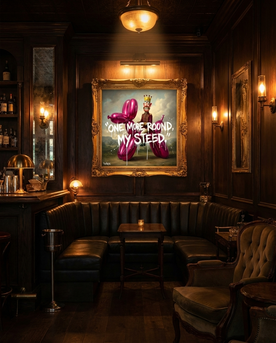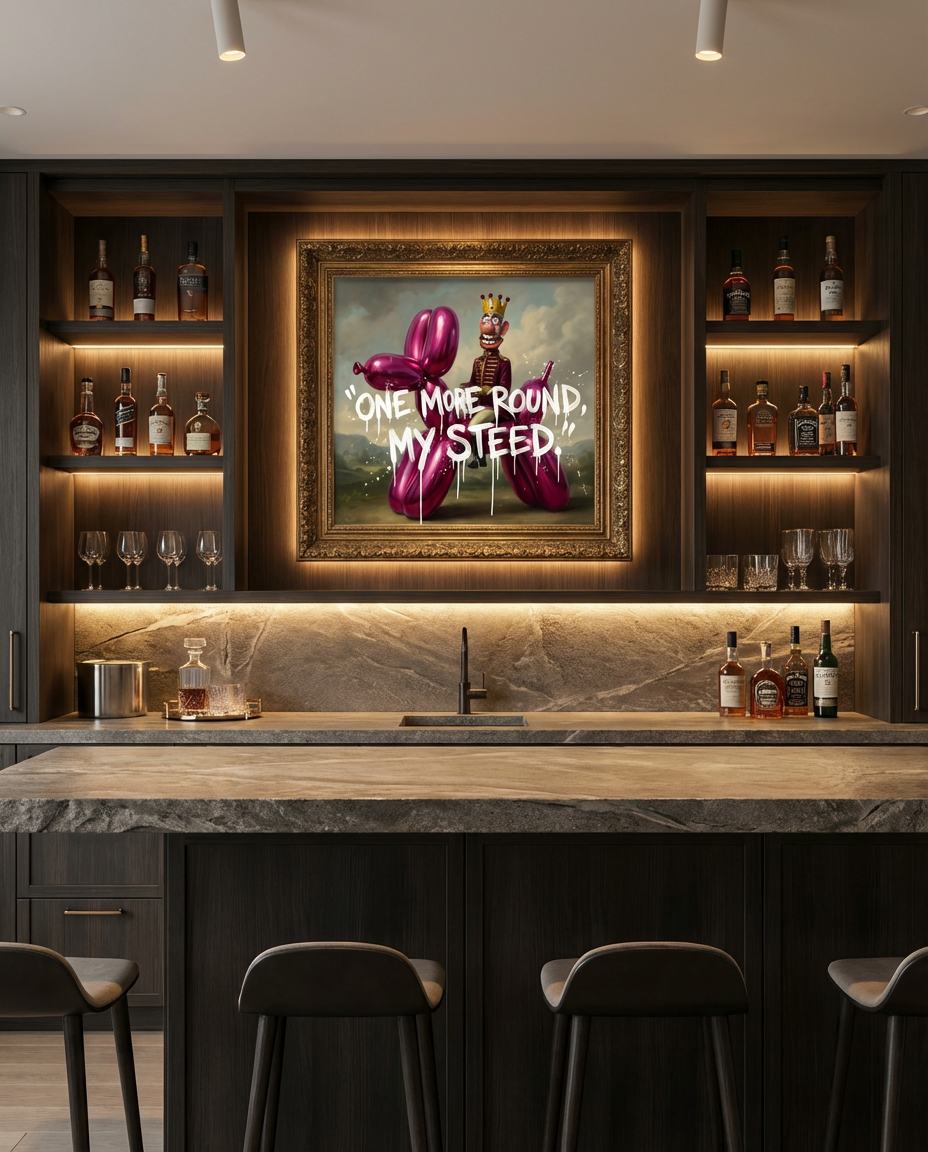 The One More Round My Steed canvas print captures the rhythm and attitude of nightlife culture through humor and visual storytelling. The phrase itself feels like something overheard in a late-night setting, where energy is high and the night keeps going.