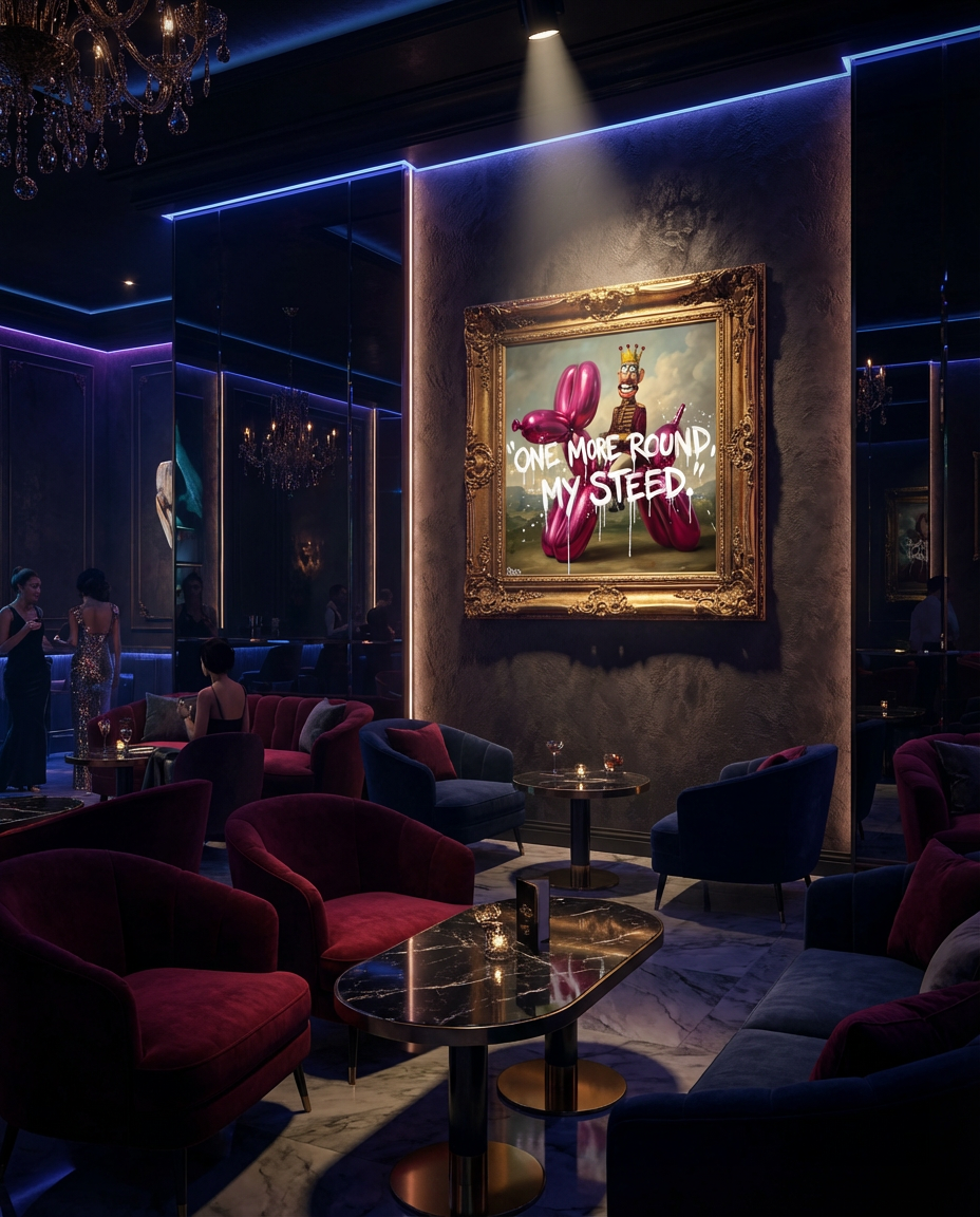 At the center of the artwork, King Draymor rides confidently atop a glossy balloon dog, turning a symbol of childhood play into a surreal vehicle of power. The phrase “One More Round, My Steed” appears boldly across the composition, reinforcing the themes of indulgence, nightlife, and relentless celebration.